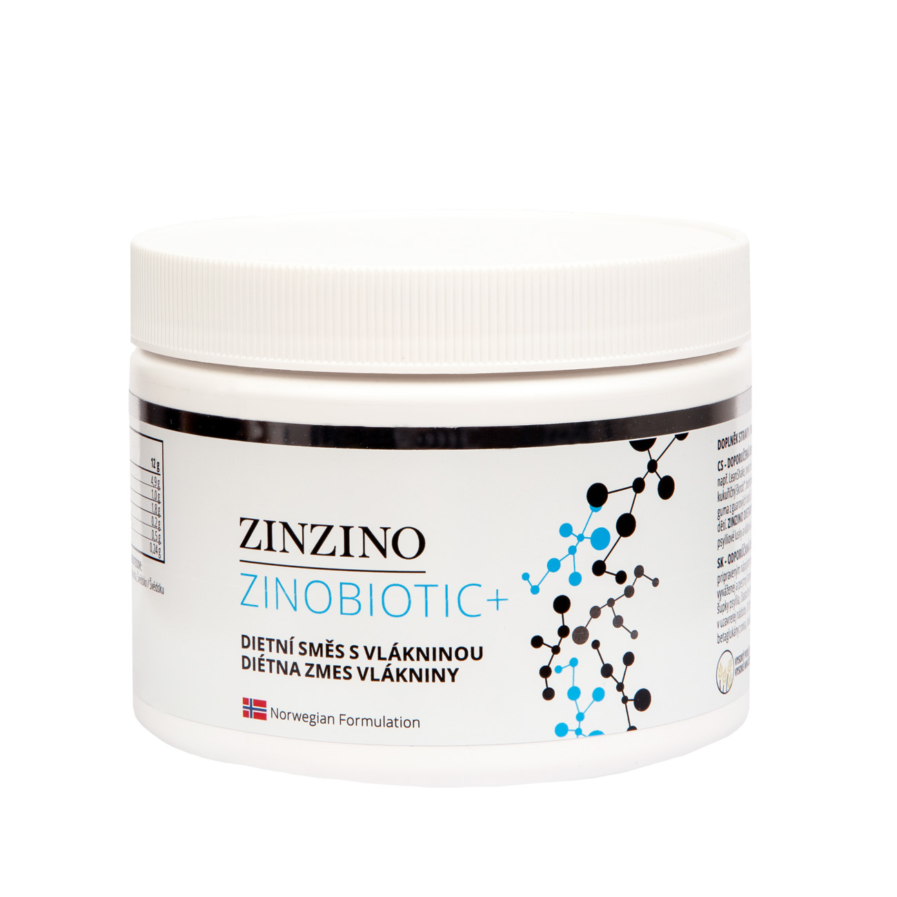 Ostatní produkty s vlákninou obvykle obsahují pouze jednu nebo dvě potravinové vlákniny, což pro vaši každodenní potřebu příjmu vlákniny nestačí. ZinoBiotic+ obsahuje významné množství osmi dietních vláken. Tento přístup zajišťuje přínos pro celé tlusté střevo. Rezistentní škrob, inulin, beta glukany z ovsa, fruktooligosacharidy (FOS) a plevy psylia jsou fermentovány v tlustém střevě a ovlivňují několik funkcí střev, například rezistentní škrob přispívá ke snížení jinak normální hladiny cukru v krvi po jídle.2